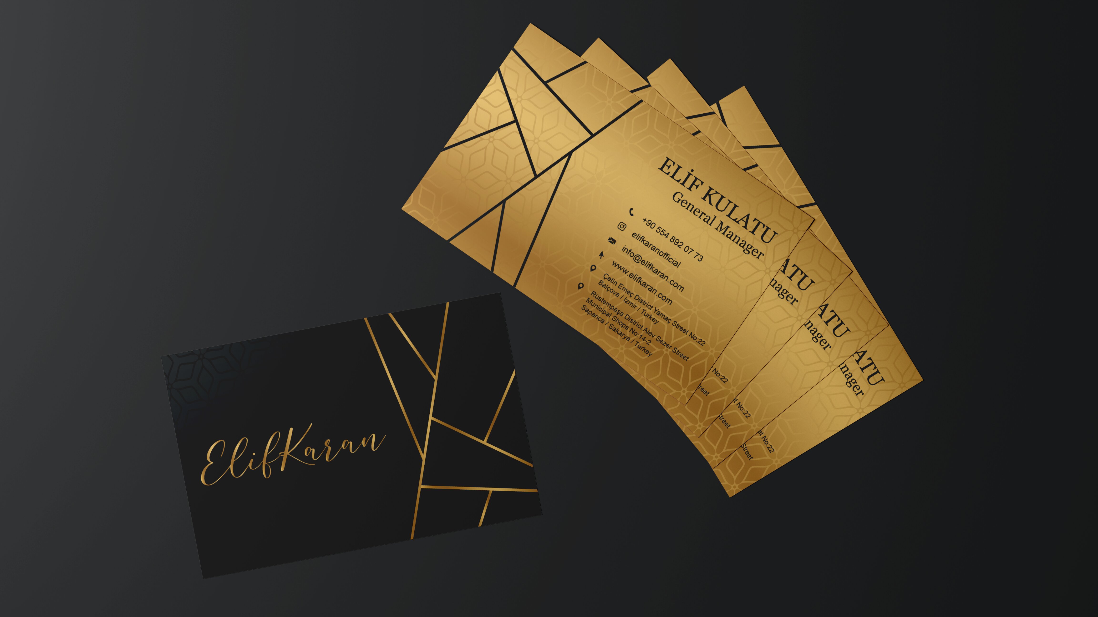 ElifKaran için tasarlanan bu kartvizit çalışmasında lüks ve prestij algısı ön planda tutulmuştur. Altın tonları ve geometrik arka plan detayları ile markanın premium hizmet anlayışı desteklenmiş, modern tipografi ile güçlü bir kurumsal görünüm elde edilmiştir.