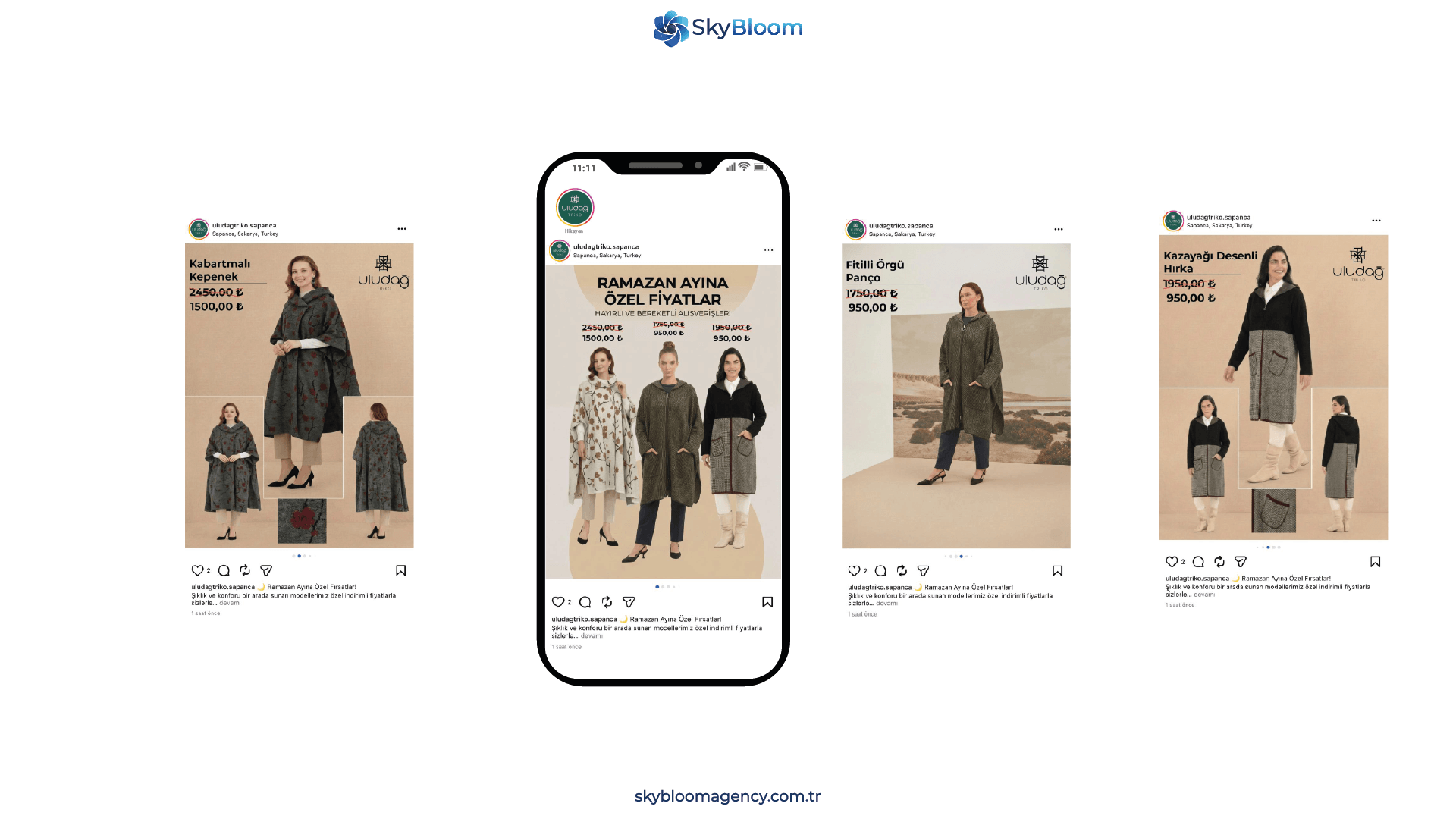 SkyBloom Agency olarak Uludağ Triko Sapanca için Ramazan ayına özel sosyal medya kampanya görselleri tasarladık. Bu projede amacımız; ürünleri, indirimli fiyatları ve kampanya mesajını Instagram kullanıcılarına hızlı ve etkili bir şekilde aktarabilecek modern bir görsel dil oluşturmaktı. Hazırlanan tasarımlarda ürün odaklı kompozisyonlar, temiz tipografi ve markanın kurumsal kimliği ile uyumlu renk paleti kullanıldı. Böylece hem kampanya mesajı güçlü şekilde iletildi hem de markanın profesyonel imajı korunmuş oldu. Proje kapsamında Instagram için kampanya postları, ürün tanıtım görselleri ve fiyat odaklı kreatif içerikler hazırlandı. Tasarımlar mobil kullanıcı deneyimi düşünülerek optimize edildi ve sosyal medya akışında dikkat çekici olacak şekilde kurgulandı. Proje Kapsamı Sosyal medya kampanya tasarımı Ürün tanıtım postları Instagram görsel içerik üretimi Kampanya ve fiyat iletişimi tasarımı SkyBloom Agency olarak markaların dijital dünyada daha güçlü görünmesini sağlayan yaratıcı ve stratejik tasarımlar üretmeye devam ediyoruz.